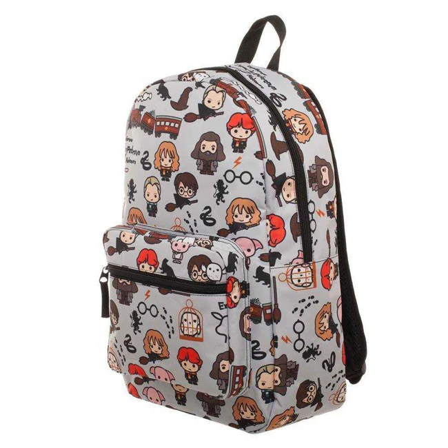 zaino grigio con personaggi Chibi e simboli Harry Potter